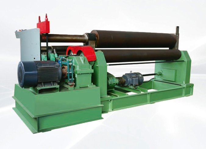 本機結構型式為三輥對稱式,上輥在兩下輥中央對稱位置作垂直升降運動,通過絲桿絲母蝸桿傳動而獲得,兩下輥作旋轉運動,通過減速機的輸出齒輪與下輥齒嚙合,為卷制板材提供扭矩。